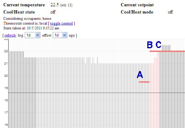 B: at roughly 5:35PM the system determined that occupants were on their way home. Looking at the logs I believe it estimated an arrival time of 5:55PM, but that’s not important; what’s important is that, at 5:35PM, the automation system told the thermostat to remove the offset so that the thermostat would now target the program temperature of 22C. Notice that the thermostat turned on the HVAC at this point, since the measured temperature was below 22C. Also note that the bars representing the measured temp are a light red, indicating that the system was heating while nobody was home.