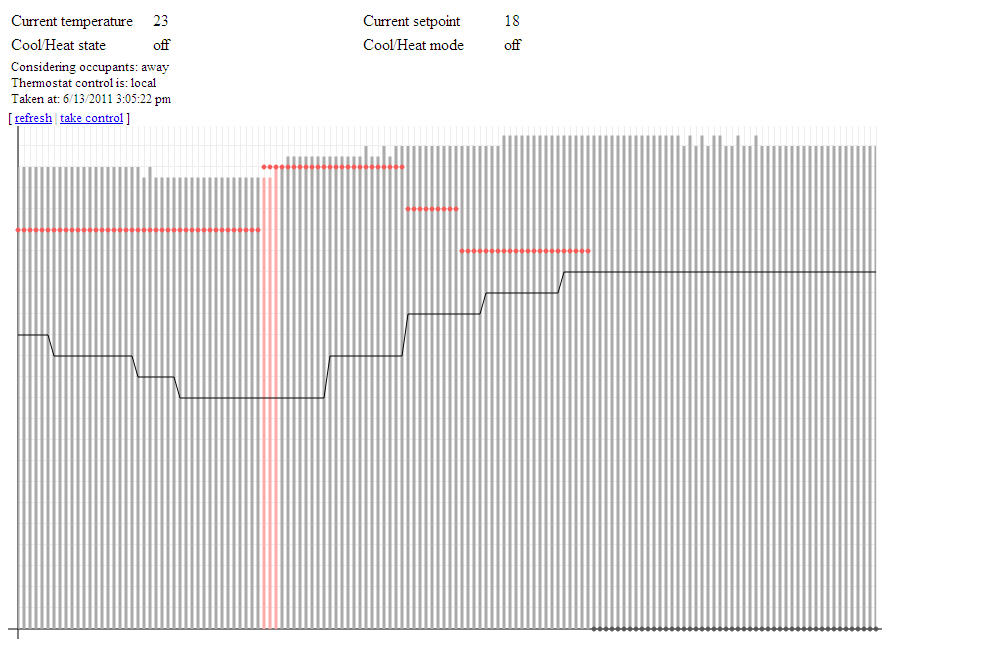 The graph actually shows quite a bit of information. The bars show interior temperature, the line shows exterior temperature, and the dots show the desired interior temperature (the “setpoint”). Both the setpoint and the interior temperature can be any of three colours each: grey, blue, or red, signifying the hvac mode and state (off, cool, or heat). So the red bars in the graph at the left show that the hvac was heating the house at that point in time, while the red dots indicate that the thermostat was in heat mode.