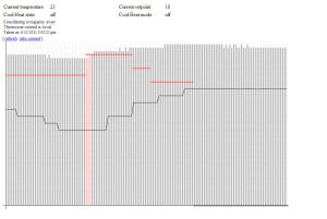 [update 2011/06/13] Here’s a screenshot of the work-in-progress webpage that provides current state and historical information about the thermostat. The graph also represents my first foray into the HTML5 canvas tag.
